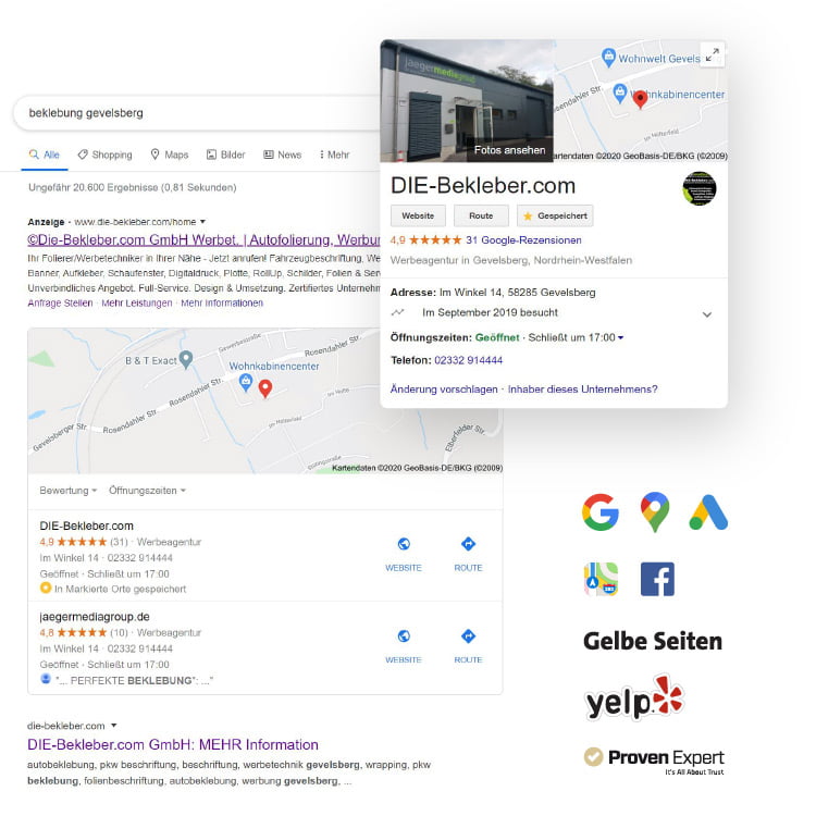 Wir tragen Ihr Unternehmen in alle wichtigen Portale/Verzeichnisse ein (Google, Maps, GelbeSeiten, etc.).